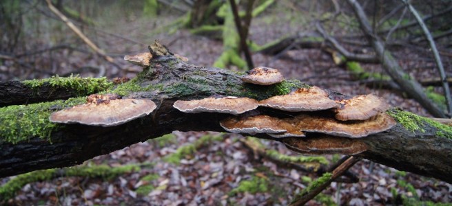 Note: The branch is mostly horizontal and so are the fungi, indicating that the fungi fruiting bodies grew after the tree / branch fell into the current position